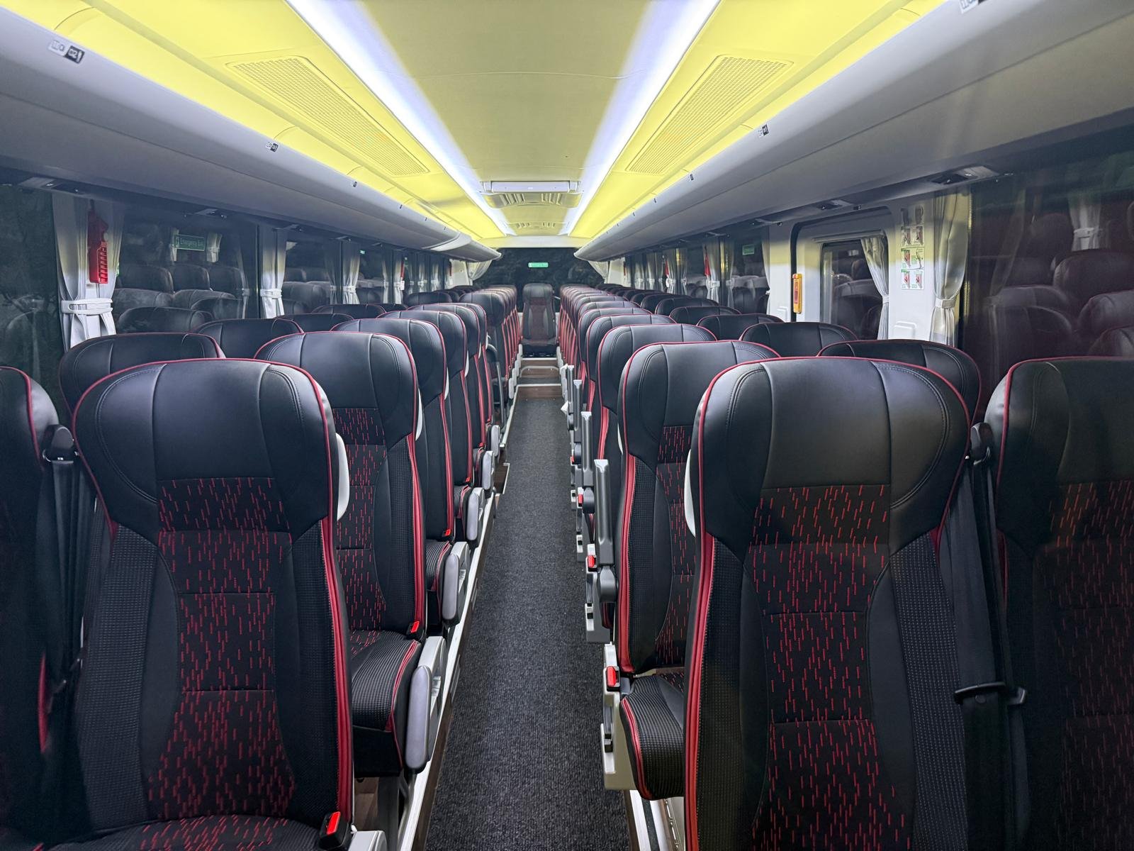 Stylish coach with 33 leather recliners, air conditioning, and a modern multimedia system onboard.
